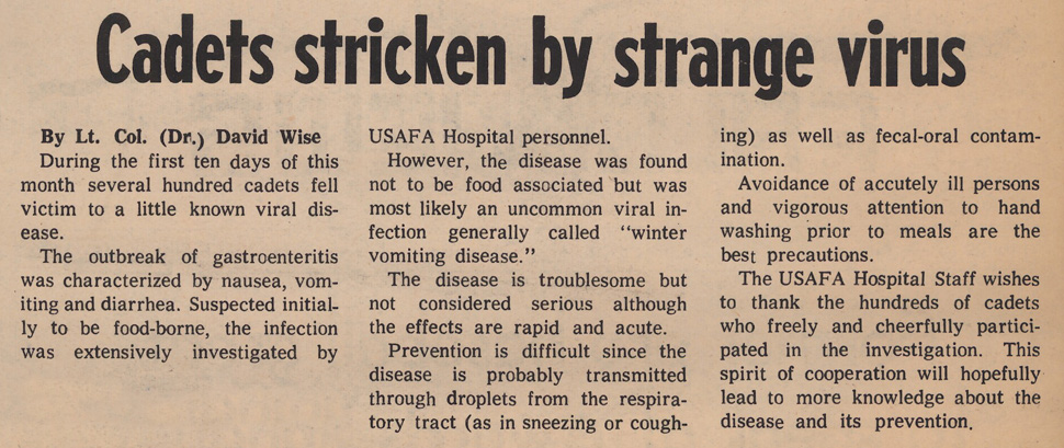 Tada! As a result, I was the ONLY person in the squadron that night who was NOT sick as a dog. I did my best to help my roommates, but I did enjoy watching the upperclass hurl everywhere, even after the toilets, showers, and bathroom sinks all stopped up. Downside was that I was the only smack available to empty trashcans in the morning for the entire squadron – most of which were full of the previous evening's repast.