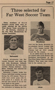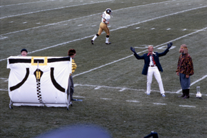 On third-and goal from about the five, the coaches send me back into the game with the next play to be called . . . another running play. I think my frustration got the better of me. I changed the play to a pass play, which we had practiced during the week, before I got to the huddle. Bob is split wide. I'm in the slot. We ran a crossing pattern to "pick off" each other's defender. Mike spotted the open receiver (Bob, in this case) and threw a perfect spiral for a touchdown. The Fans Go Wild!